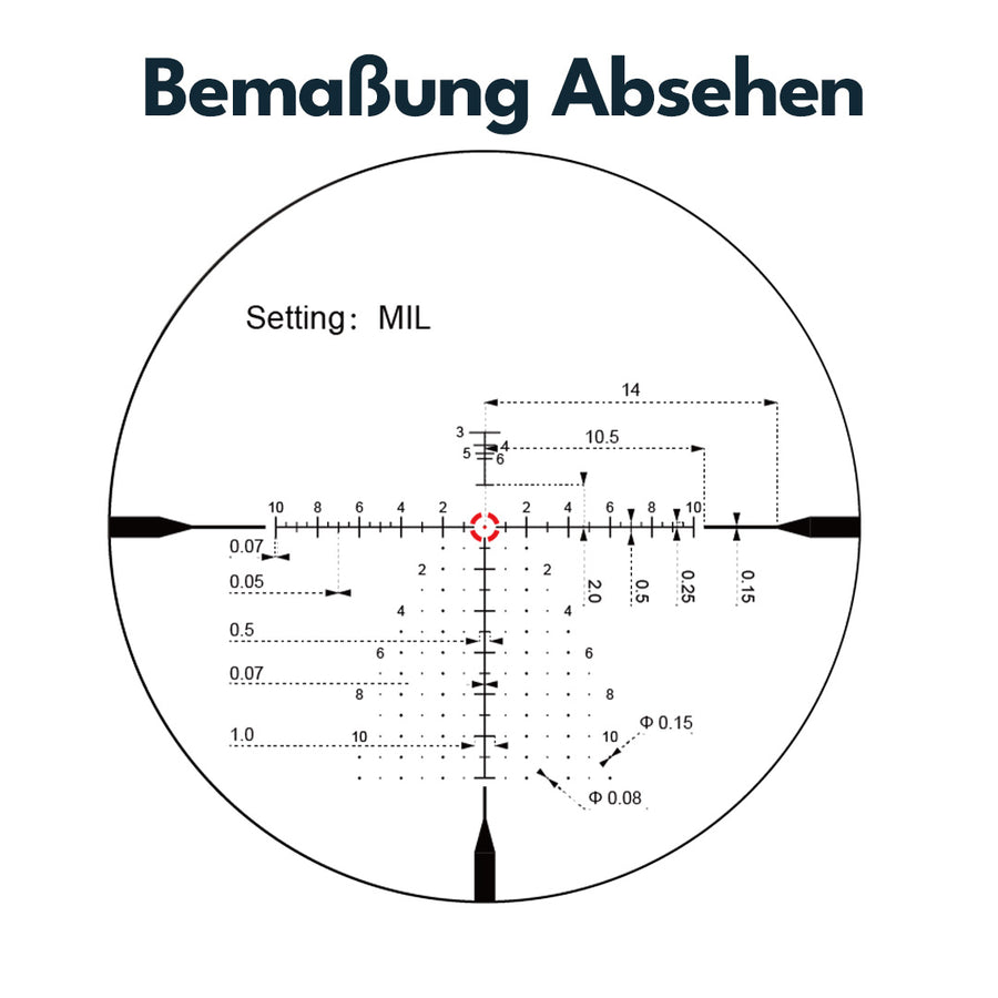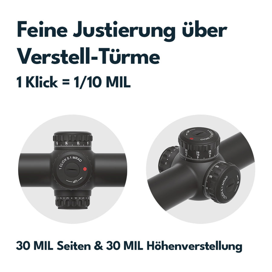 Zu den bemerkenswertesten Eigenschaften dieses Zielfernrohrs gehören das beleuchtete Absehen mit 11 Stufen welches der Umgebungshelligkeit angepasst werden kann um das Ziel schnell zu erfassen und die feine Verstellung in 1/10MIL Schritten. Dies ermöglicht eine bessere Sichtbarkeit des Absehens bei schlechten Lichtverhältnissen oder in der Dämmerung und eine feine Anpassung der Zielgenauigkeit um das Zielfernrohr optimal in Ihre individuellen Bedürfnisse und Schießbedingungen anzupassen.